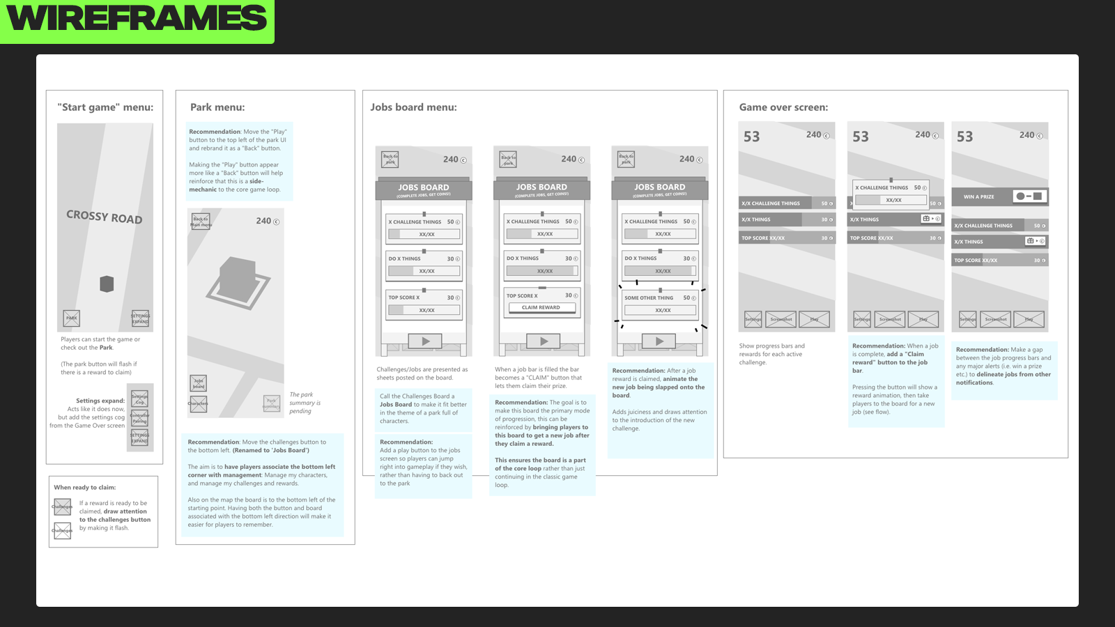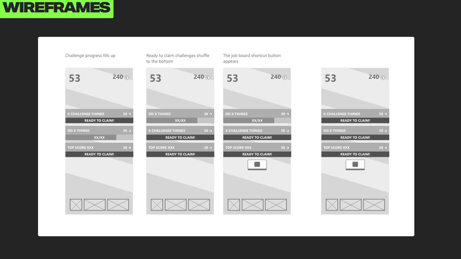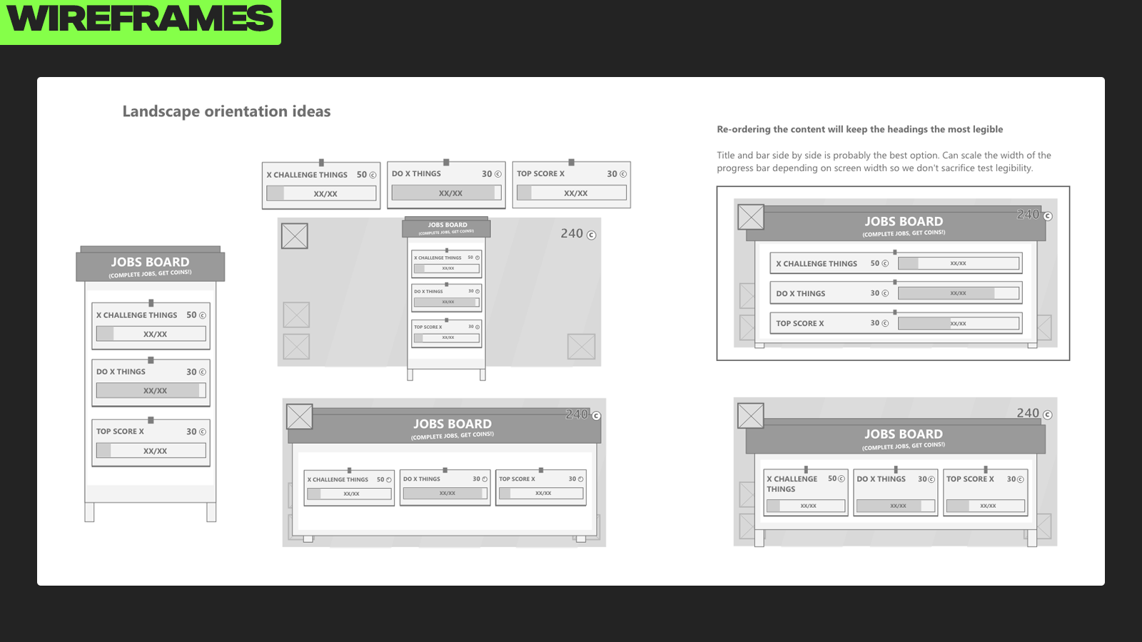 I wireframed the jobs board screen itself and how players would access it, as well as when we would present the information of their progress to players after each game. Also the board itself needed to be responsive across various screen sizes and orientations.