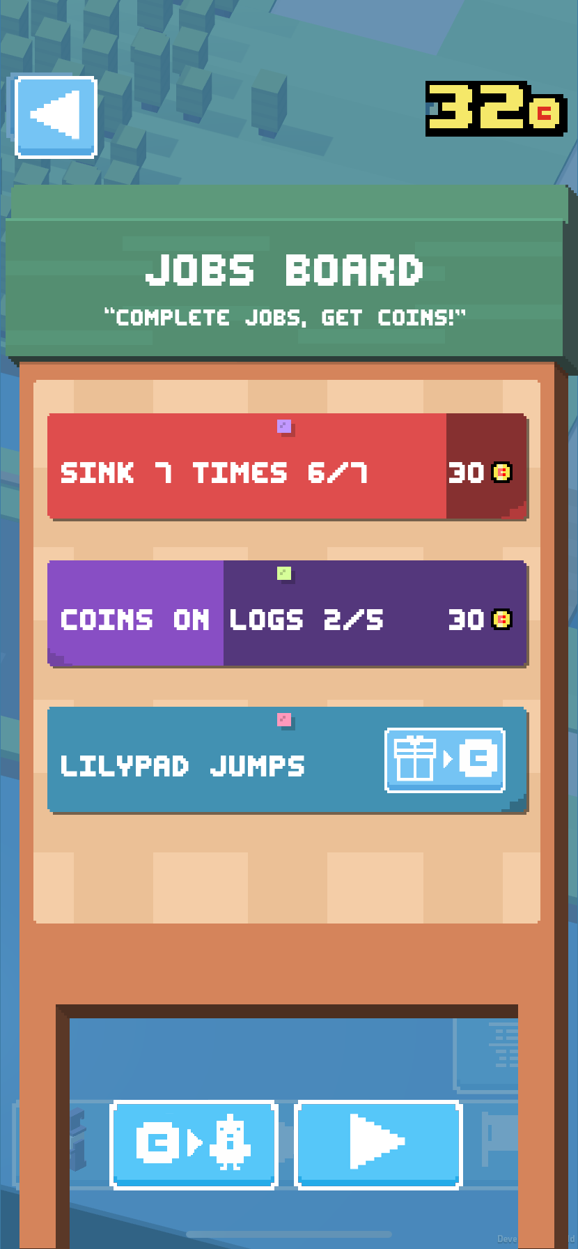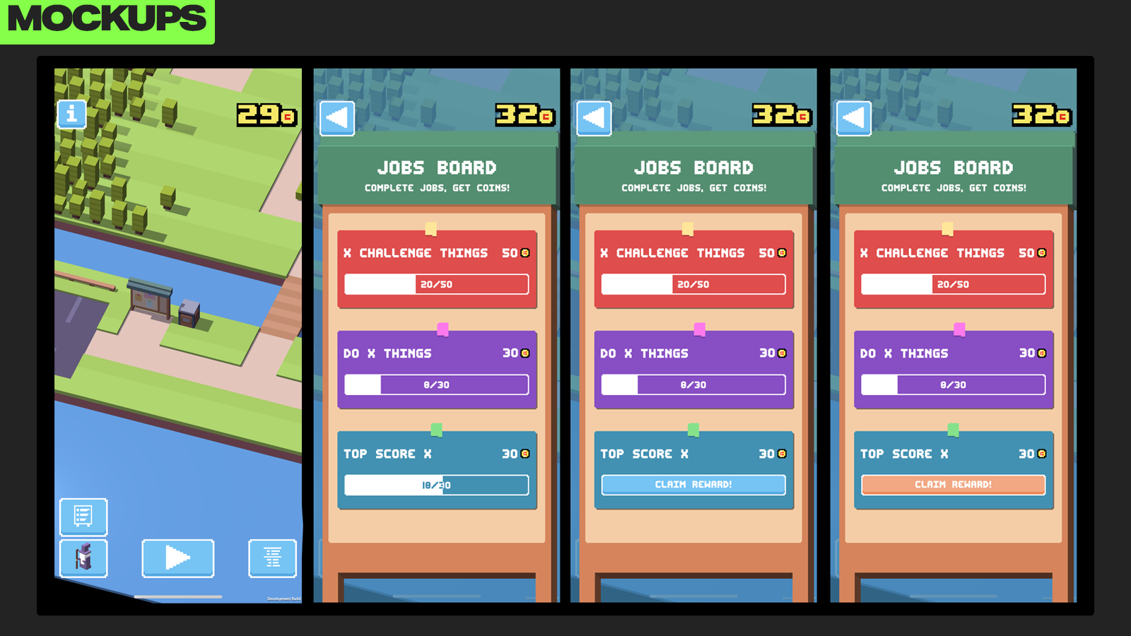One of the game's new features was an overworld called "Crossy Park" that would grow and populate as the player progressed through the game, so I designed the challenge system as a "Jobs Board" that would have a physical place within the park.