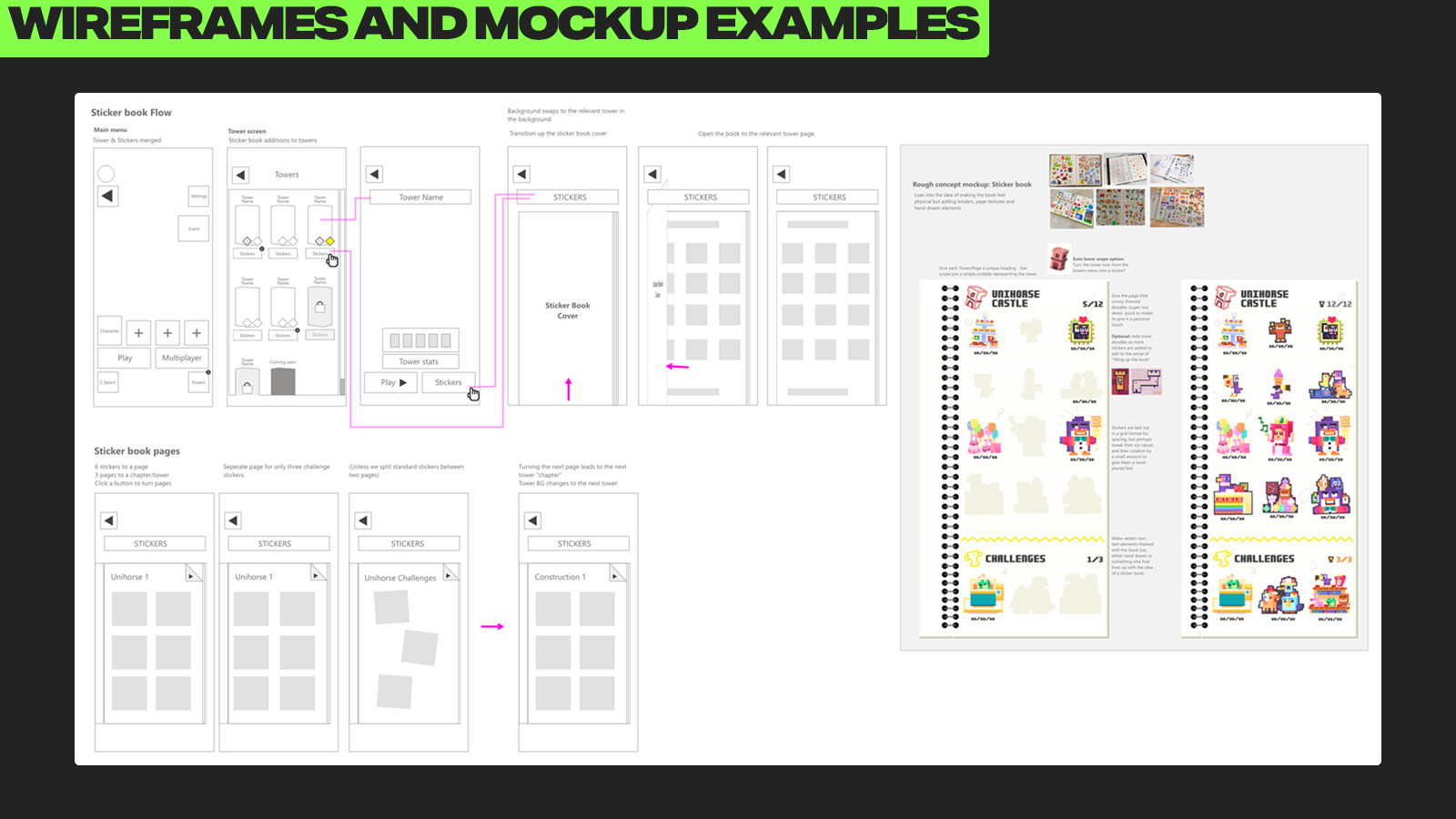 First I wireframed the designed the sticker book to make sure it worked as a responsive layout, then I mocked up a design to show the book as a classic schoolyard notebook while still maintaining the "Crossy" pixel art style before turning that into assets to be imported into Unity.