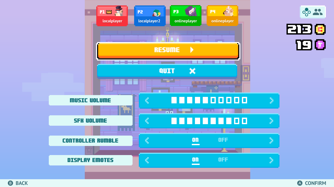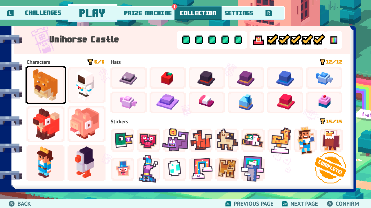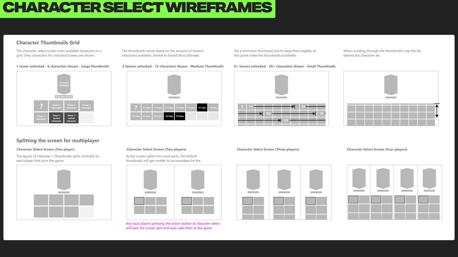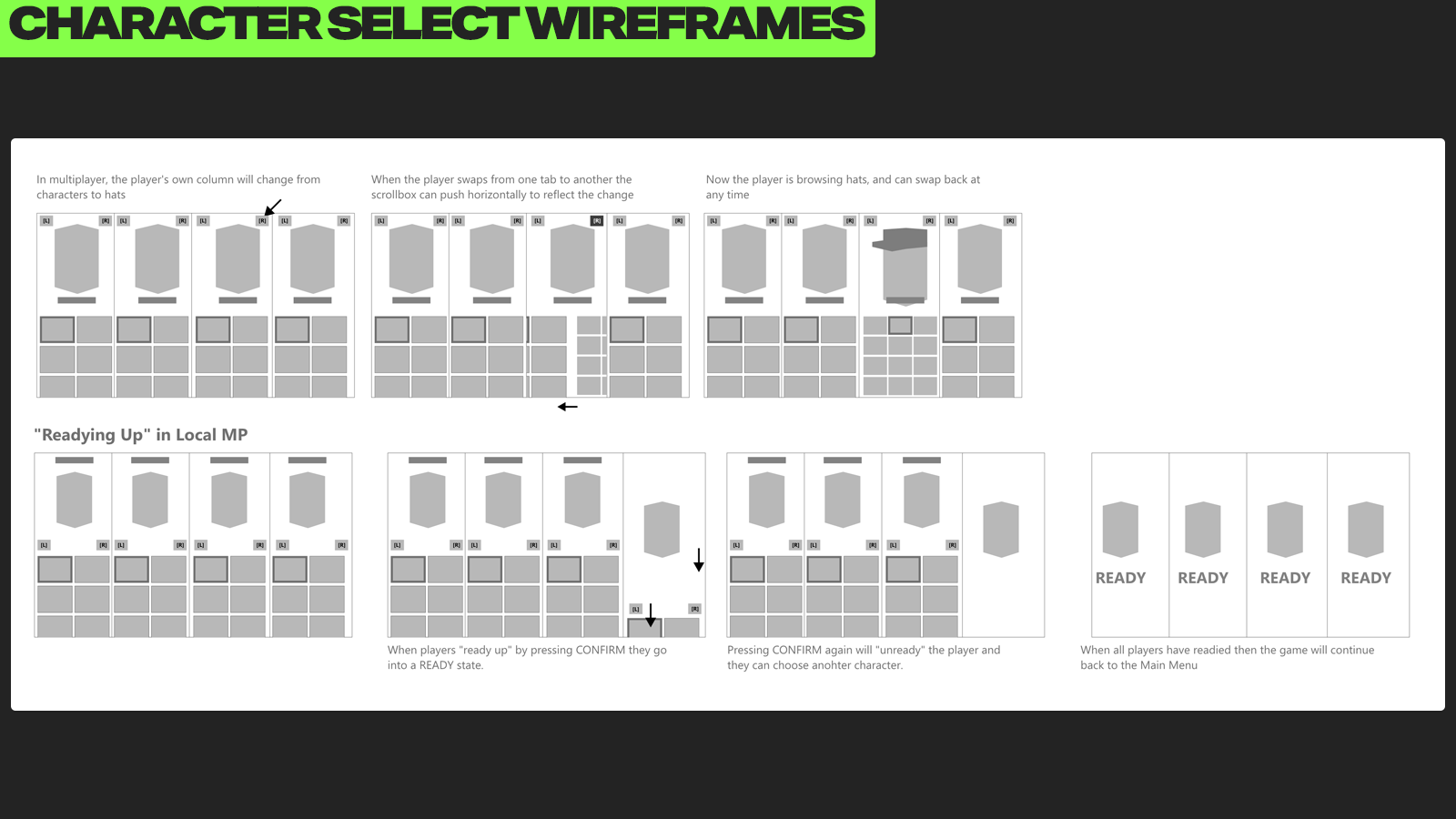One particular challenge was redesigning the character and hats select experience. When the original game launched in 2020 the character select experience was designed for touch-screens with only a few characters to choose from. Since then the number of characters and hats to choose from had grown significantly, so I had to work out a suitable way for players to browse from over 60 characters and over 100 hats in a way that worked well with a controller. This also had to work with four players at the same time, that's a lot of information to present on the one screen but we managed to come up with an elegant solution that felt fun and arcade-y.