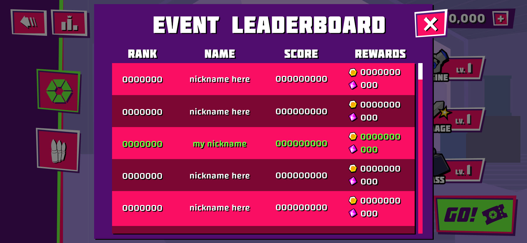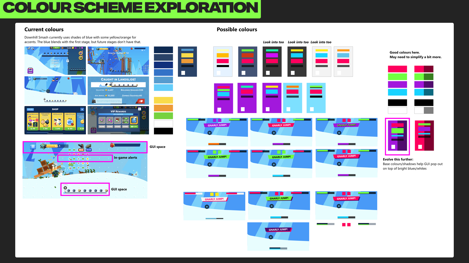 My roles included exploring art styles and colour schemes for the game's UI, creating mockups to show how the new UI style and layouts would look across the entire game, and creating assets to be implemented in Unity.